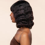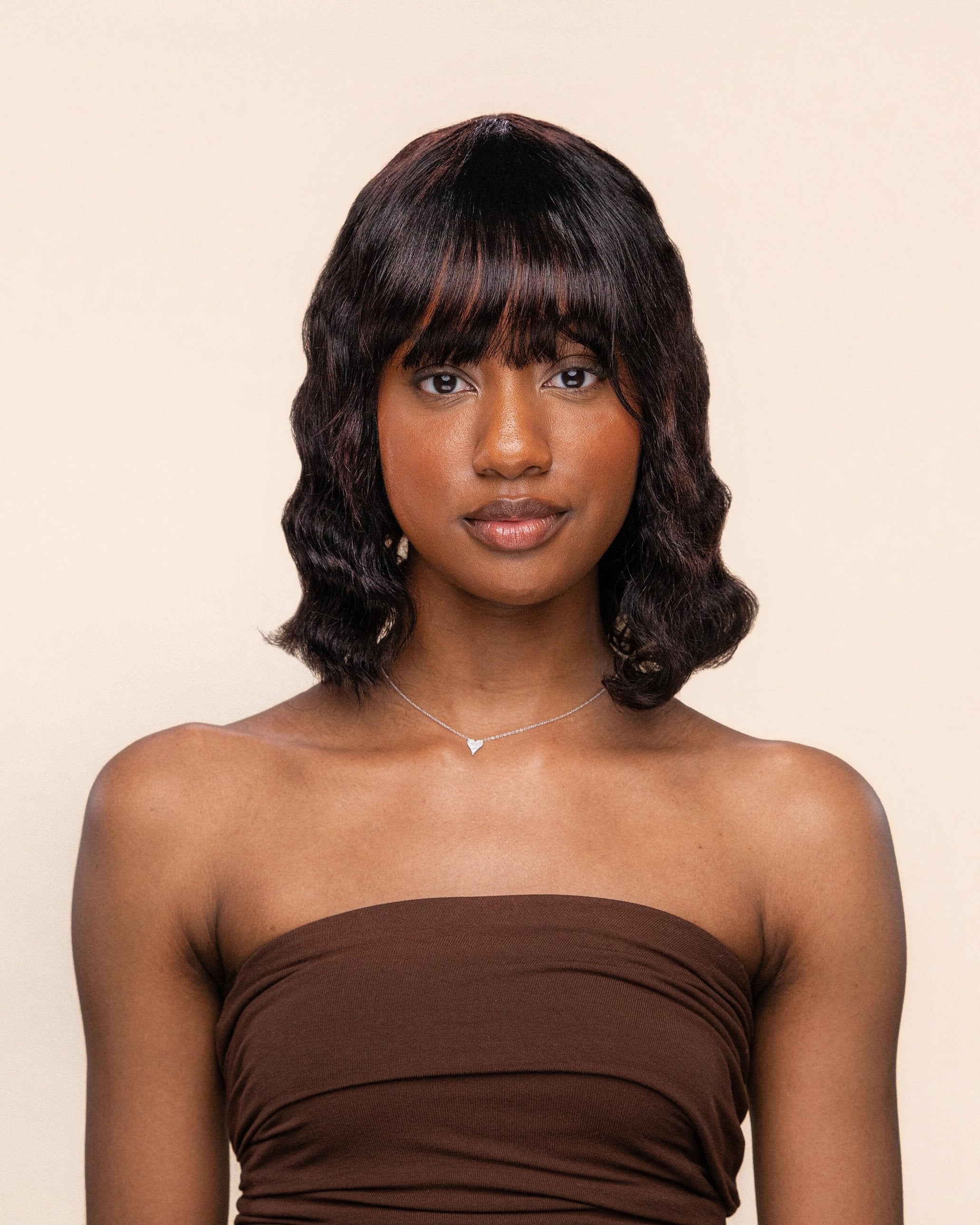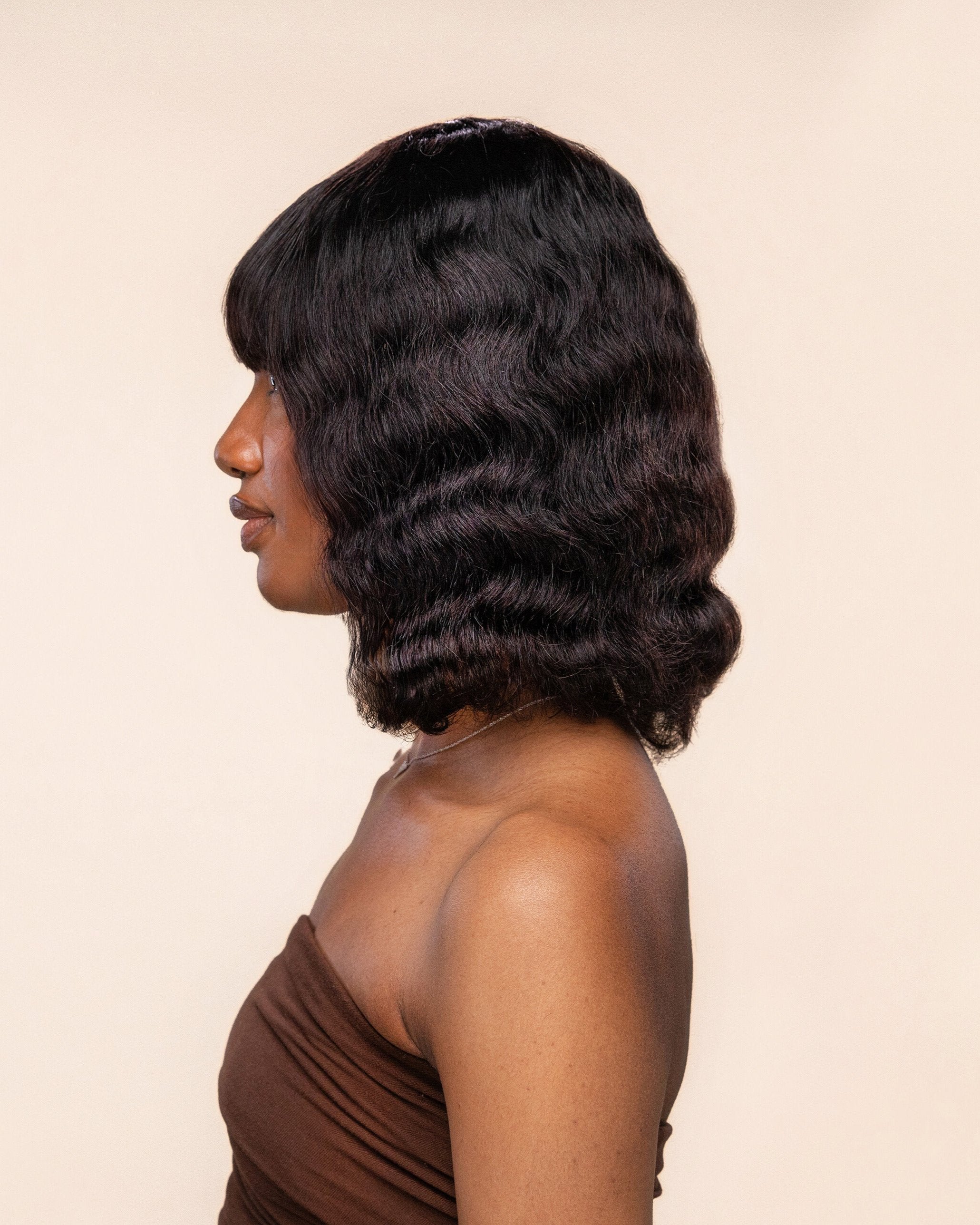 Transform your look effortlessly with our 12-Inch Wavy Human Hair Wig featuring stylish bangs. This wig offers a luxurious feel and natural movement, allowing you to embrace a chic style with confidence and ease.