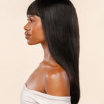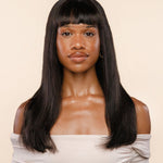 Upgrade your style with Janet, a sleek 18-inch wig made from premium human hair. The straight-cut bangs give a sharp, structured finish, while the natural black color enhances any look with understated sophistication. With 200% density for an extra full-bodied appearance and a T-style lace closure that creates a seamless, natural hairline, this wig delivers a polished, modern look that’s as comfortable as it is stylish.